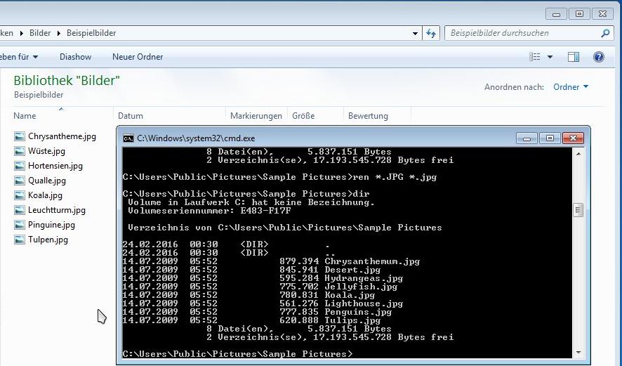 Eingabeaufforderung: Befehl: ren *.JPG *.jpg