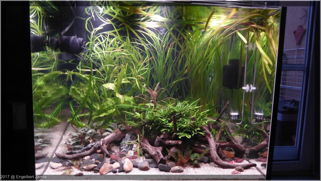 Habe die Ausläufer der Valis stark beschnitten und von den Echis einige nicht mehr schöne äußere Blätter entfernt. Ansonsten 50% Wasser raus und mit hartem Leitungswasser wieder befüllt.