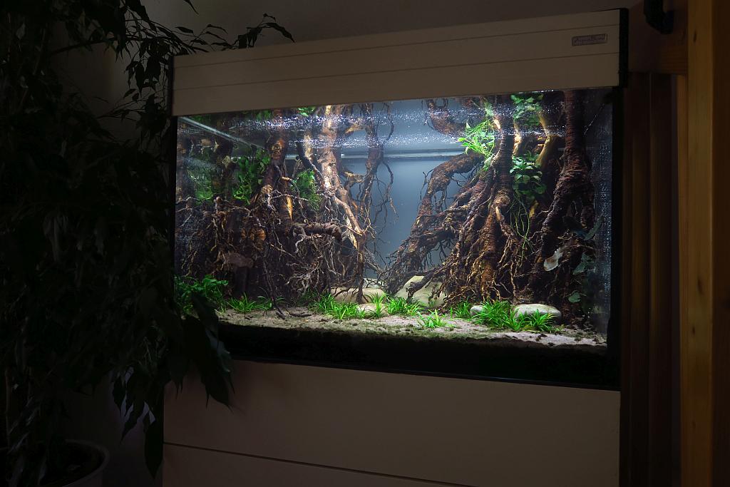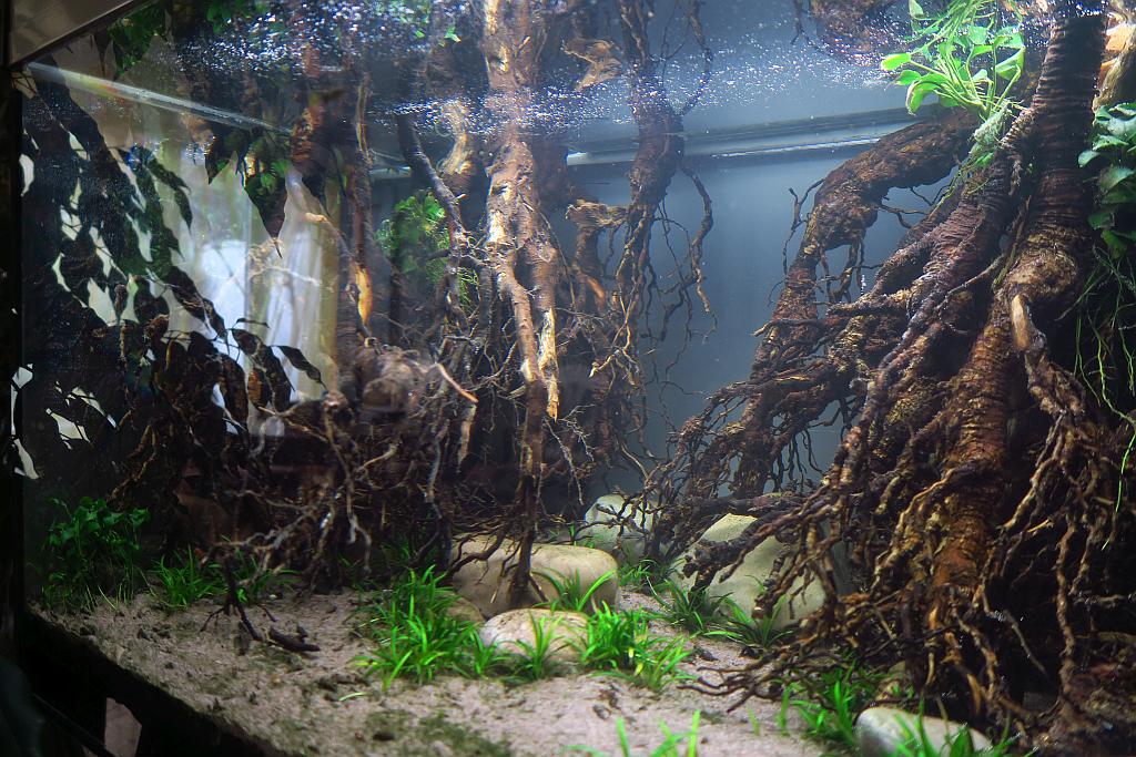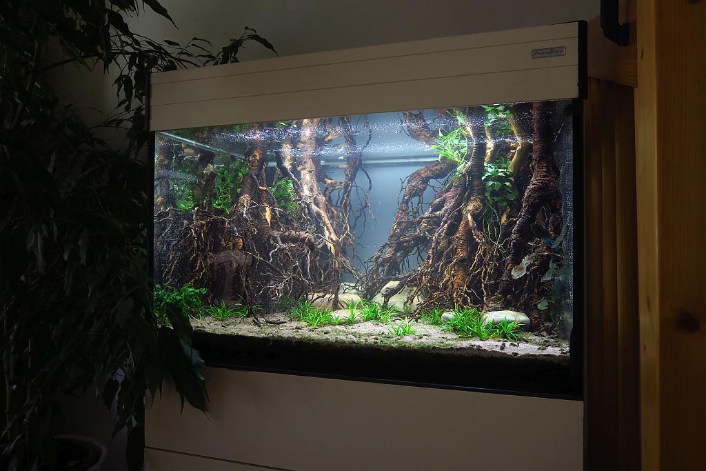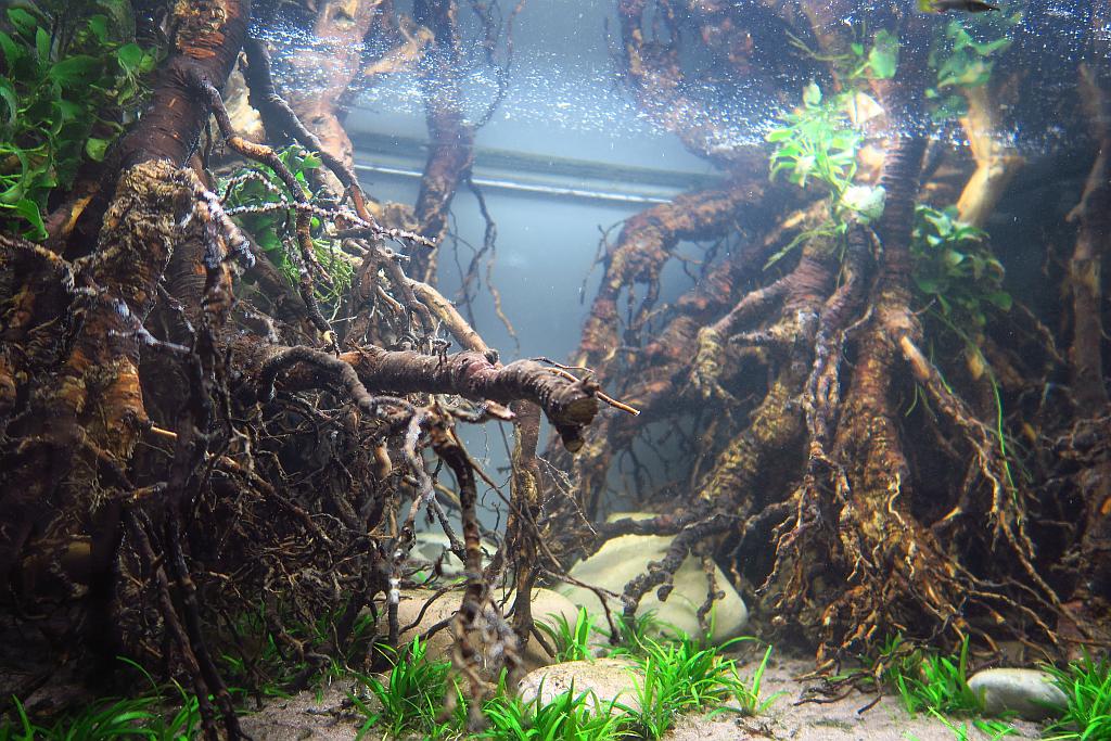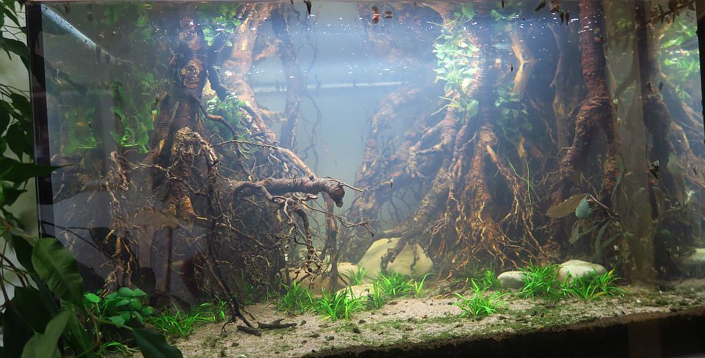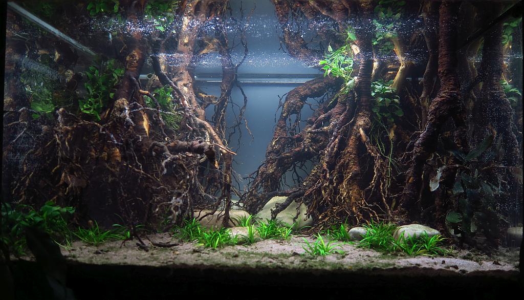 Das Becken ist geschlossen so dass die Oberseite der Stämme größtenteils unsichtbar sind. Wo ein Abschnitt Unterwasser liegt werde ich ihn mit Anubia oder Bucepalandras bepflanzen/verstecken. Auf den Wurzeln finden oft irgendwelche Sporen von emersen Waldmoosen durch die Wurzen ein neues Zuhause. Ich lasse mich da von der Biologie mal überraschen.