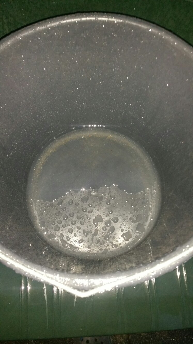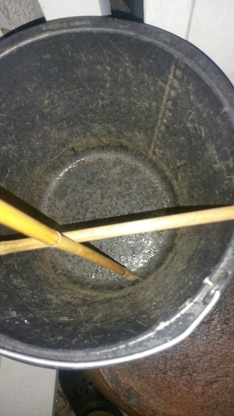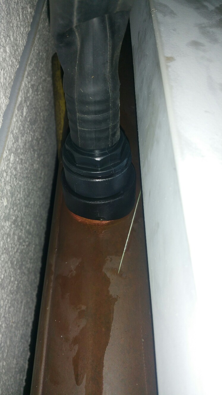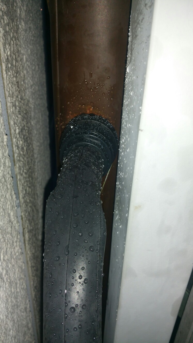 Schlauch hatte ich für den großen 33mm Stutzen natürlich auch nicht und musste erstmal einen durchgeschnittenen Fahrradschlauch verwenden, den ich auch nur mit einem Bambusstab in einen Eimer umlenken konnte.