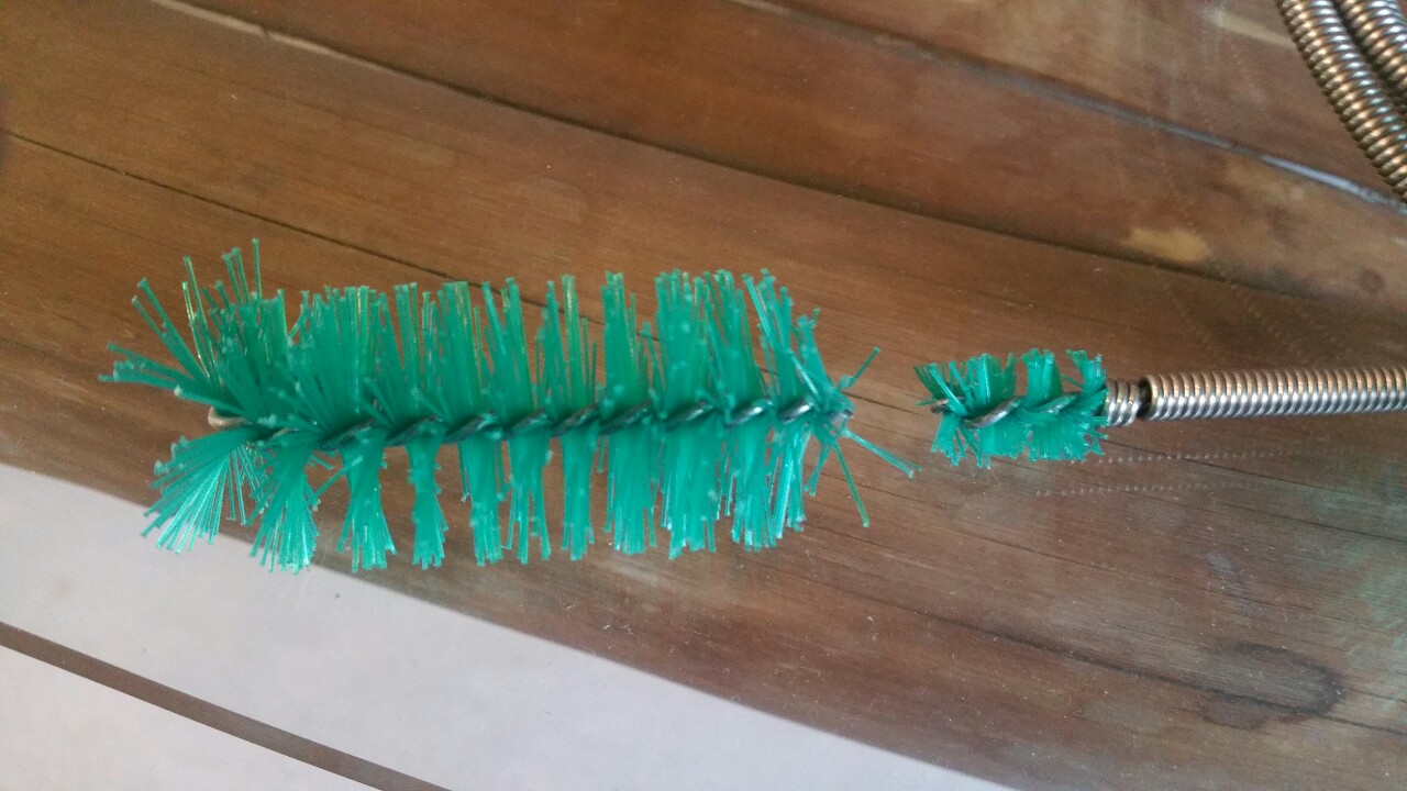Außerdem habe ich die Bürstenlänge um 3/4 auf ca. 2cm gekürzt damit sie leichter um enge Radien geht. Der unflexible Bürstenkopf ist für enge Radien in den Rohrverbindern nämlich zu lange um die Kurve zu kriegen.