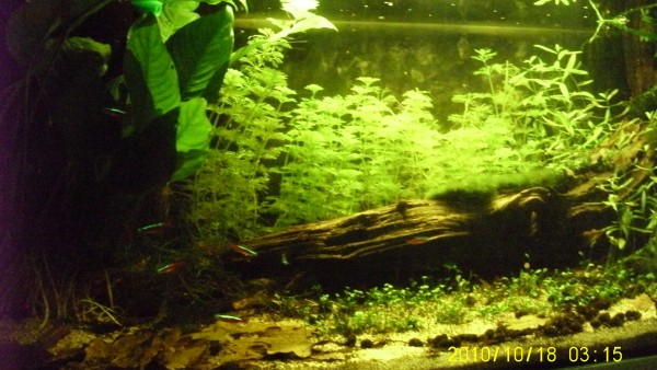 Nun zu meinem Aquarium. Es ist ein 1m Becken mit Standardabmessungen und enthält abzüglich Deko etwa 150 Liter Wasser. Es wird von drei LEDs mit je ein Watt beleuchtet. Die Leuchte habe ich selbst gebaut. Gefiltert wird mit einem Mattenfilter und einer 5W-Pumpe in der Ecke hinten links, ebenfalls mein erster Selbstbau. Da steckt auch der Heizer drin, das Becken hat das ganze Jahr 22°C. Es wird von 15 roten Neons und Wasserschnecken bewohnt. Es ist mit Regenwasser gefüllt und durch regelmäßiges Einbringen von Laub und Erlenzapfen in Richtung Schwarzwasser orientiert.