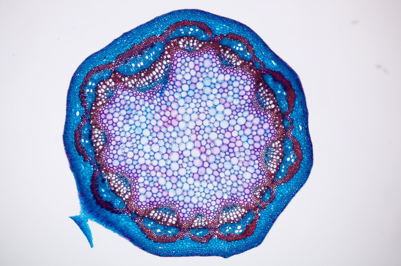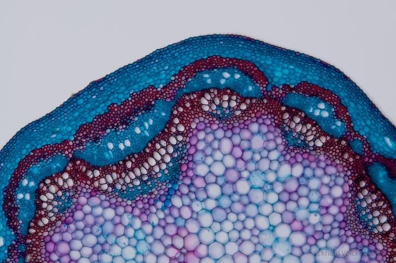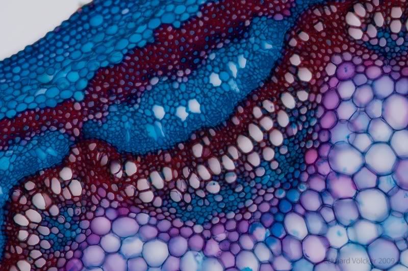 hier das Ergebnis eines Experimentes. Ein Ahornzweig eingebettet in einer Mohrrübe geschnitten und 5 Minuten in Natriumhypoclorid gebleicht. 3 x in Aqua dest. ausgewaschen, 10 Minuten gefärbt (Astrablau, Chrysoidin, Fuchsin), dann in Isopropanol ausgewaschen.