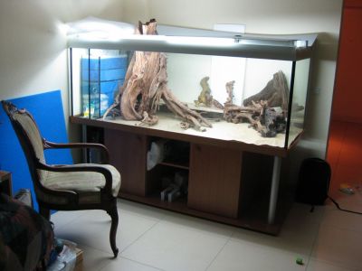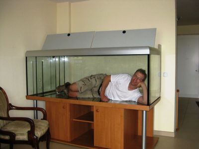 Im Juli 2010 kam dann nach das lang gesuchte Becken, hurra!!! happy Monatelang bin ich das Netz gesurft, bis ich endlich die Maße hatte - eher größer als kleiner, und ich hab`s nicht bereut. 70er Höhe ist optimal, weil man ohne Hilfsmittel und Taucherbrille überall auf den Boden kommt. 2 Meter Breite sind Kinopanorama, wenn man davor sitzt - man sieht gerade die Ränder nicht mehr und ist voll eingenommen. Die Tiefe könnte mehr sein, aber wie gesagt. Das Ganze als günstiger Restposten ergattert bei einem professionellen Bauer, und mit 4 Mann und ein paar Flaschen Bier noch recht gut zu tragen (ca. 260 Kilo). Der Deckel ist nur 10cm hoch! Und ein erster Gewichttest mit meinem Eigengewicht war erfolgreich, der Unterschrank hielt! Voller Elan machte ich also weiter.