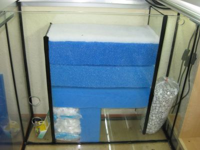 Zuerst habe ich brav den Filter befüllt. Auch dazu hatte ich viel gelesen. Aus früheren Zeiten hatte ich Erfahrung mit Biofiltern, die im Vergleich zu den teuren käuflichen Filtern um ein Vielfaches wartungsärmer und dazu noch effektiver sind. Ideal für faule Leute wie mich. lol2 Aus Sicherheitsgründen und um das ganze System so simpel wie möglich zu halten, habe ich mich für einen Innenfilter entschieden und 20cm links vom Becken abtrennen lassen, also 10% oder 110 der 1120 Liter.