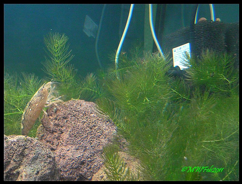 Bei genauerem hinsehen, sind Hydra und tausende kleine dünne Würmchen im Becken...die seh ich nur, wenn ich mich fast auf den Bauch lege und von unten nach oben gegen das Licht schaue...