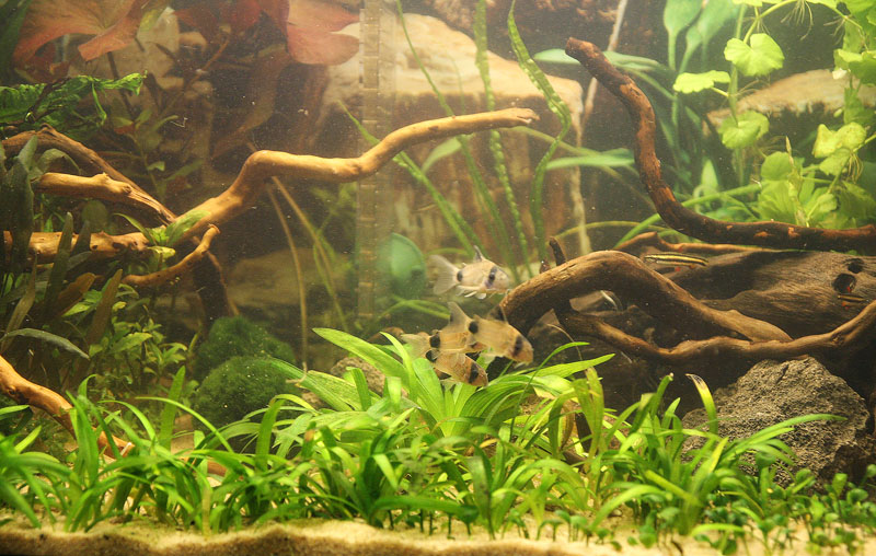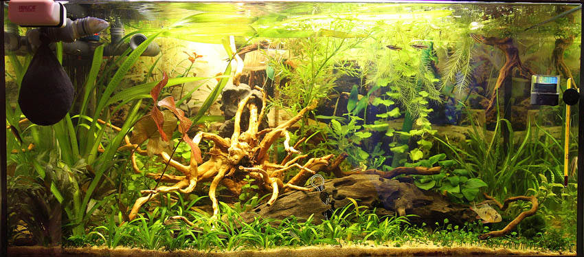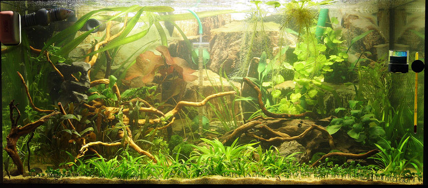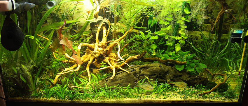 Im Moment wird es darauf hinauslaufen, dass die große Wurzel nun links hinkommt (also richtig links, nicht so wie hier auf den Fotos). Im Hintergrund macht sich die Valli breit. In den Astzwischenräumen werde ich dann das langsamwachsende Fettblatt und die Ludwigia pflanzen, ebenso den Wasserkelch, der jetzt vorne an der Scheibe klebt. Evtl. noch etwas am Bodendecker arbeiten, das Pfeilkraut macht sich aber schön breit derzeit und das Kleeblattteil sieht man kaum noch. Muss mal schauen, wie man Ausläuferpflanzen im Bodengrund kürzen kann, ohne gleich alles herauszureissen - man weiß ja nicht, wie was wächst. Das ganze wird etwas mit Sand aufgeschüttet, auch wenn das jetzt kein rießen Berg wird wegen der Wurzel und der Aquarienabdeckung. Außerdem sind hier auch schon zahlreiche Ausläufer vom Pfeilkraut und Valli.