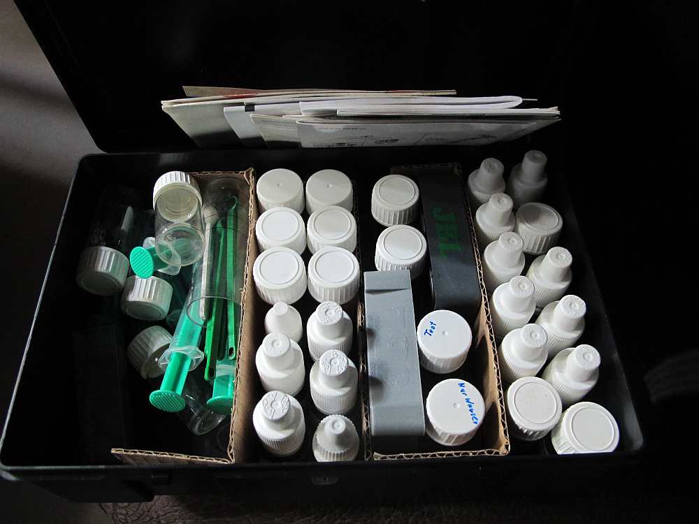Beim durchstöbern meiner vielen Schachteln mit Kleinteilen ist mir dann mein JBL_Testkoffer in die Hände gefallen und durch das Nachkaufen von Messflüssigkeiten hatte ich da ein paar Misch-Mess-Fläschchen übrig.